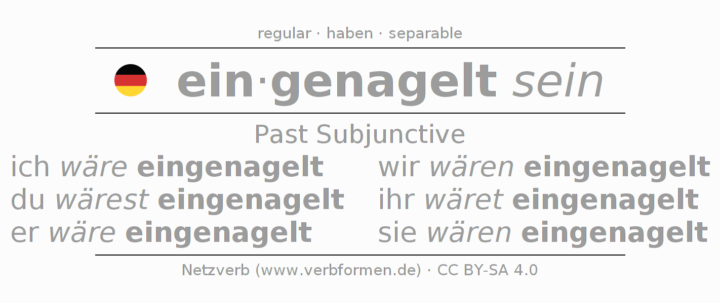 The conjugation of einnageln in Subjunctive Imperfect Form of possibility Statal Passive is ich wäre eingenagelt, du wärest eingenagelt, er wäre eingenagelt, wir wären eingenagelt, ihr wäret eingenagelt, sie wären eingenagelt.The conjugation corresponds to certain grammatical rules. Likewise the requirements for the conjugation of the simple verb forms of einnageln in Imperfect Subjunctive. Comments ☆