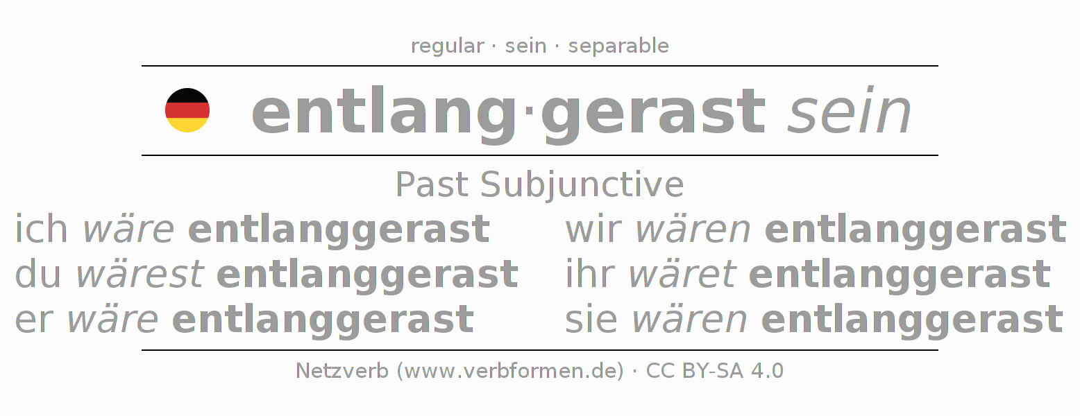 The conjugation of entlangrasen in Subjunctive Imperfect Form of possibility Statal Passive is ich wäre entlanggerast, du wärest entlanggerast, er wäre entlanggerast, wir wären entlanggerast, ihr wäret entlanggerast, sie wären entlanggerast.The conjugation corresponds to certain grammatical rules. Likewise the requirements for the conjugation of the simple verb forms of entlangrasen in Imperfect Subjunctive. Comments ☆
