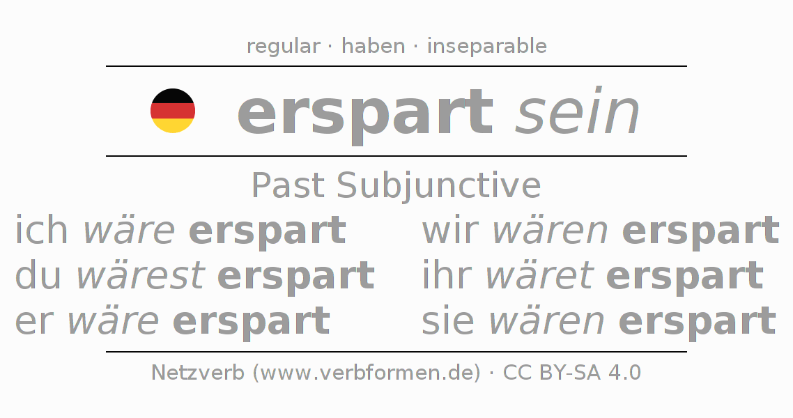 The conjugation of ersparen in Subjunctive Imperfect Form of possibility Statal Passive is ich wäre erspart, du wärest erspart, er wäre erspart, wir wären erspart, ihr wäret erspart, sie wären erspart.The conjugation corresponds to certain grammatical rules. Likewise the requirements for the conjugation of the simple verb forms of ersparen in Imperfect Subjunctive. Comments ☆