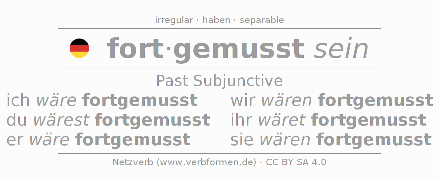 The conjugation of fortmüssen in Subjunctive Imperfect Form of possibility Statal Passive is ich wäre fortgemusst, du wärest fortgemusst, er wäre fortgemusst, wir wären fortgemusst, ihr wäret fortgemusst, sie wären fortgemusst.The conjugation corresponds to certain grammatical rules. Likewise the requirements for the conjugation of the simple verb forms of fortmüssen in Imperfect Subjunctive. Comments ☆