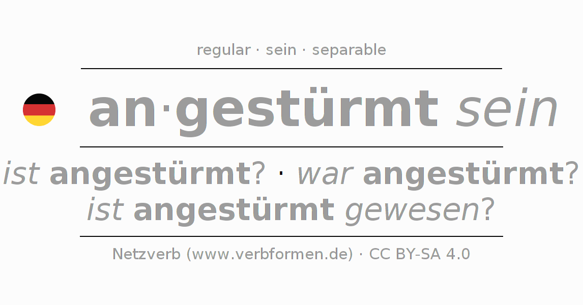 The conjugation of anstürmen in Subjunctive Imperfect Form of possibility Statal Passive is wäre ich angestürmt?, wärest du angestürmt?, wäre er angestürmt?, wären wir angestürmt?, wäret ihr angestürmt?, wären sie angestürmt?.The conjugation corresponds to certain grammatical rules. Likewise the requirements for the conjugation of the simple verb forms of anstürmen in Imperfect Subjunctive. Comments ☆
