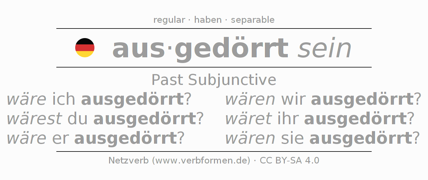 The conjugation of ausdörren in Subjunctive Imperfect Form of possibility Statal Passive is wäre ich ausgedörrt?, wärest du ausgedörrt?, wäre er ausgedörrt?, wären wir ausgedörrt?, wäret ihr ausgedörrt?, wären sie ausgedörrt?.The conjugation corresponds to certain grammatical rules. Likewise the requirements for the conjugation of the simple verb forms of ausdörren in Imperfect Subjunctive. Comments ☆