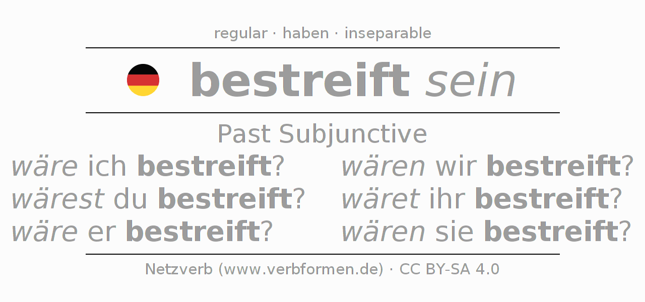 The conjugation of bestreifen in Subjunctive Imperfect Form of possibility Statal Passive is wäre ich bestreift?, wärest du bestreift?, wäre er bestreift?, wären wir bestreift?, wäret ihr bestreift?, wären sie bestreift?.The conjugation corresponds to certain grammatical rules. Likewise the requirements for the conjugation of the simple verb forms of bestreifen in Imperfect Subjunctive. Comments ☆
