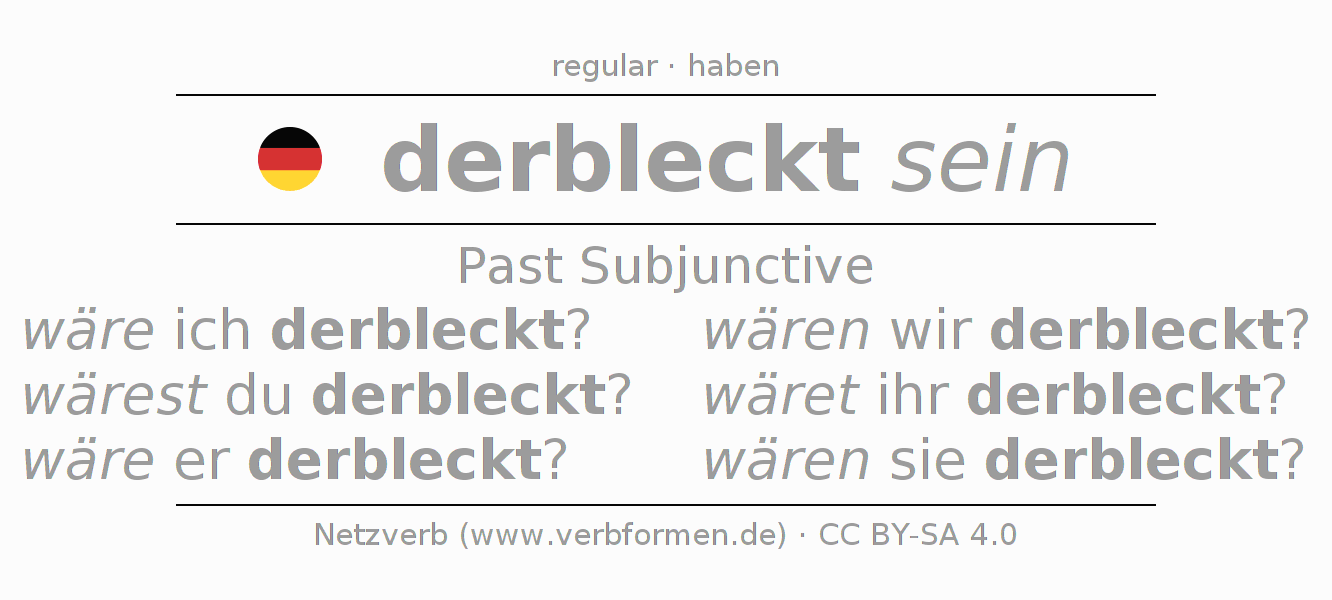 The conjugation of derblecken in Subjunctive Imperfect Form of possibility Statal Passive is wäre ich derbleckt?, wärest du derbleckt?, wäre er derbleckt?, wären wir derbleckt?, wäret ihr derbleckt?, wären sie derbleckt?.The conjugation corresponds to certain grammatical rules. Likewise the requirements for the conjugation of the simple verb forms of derblecken in Imperfect Subjunctive. Comments ☆