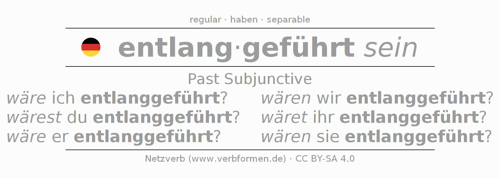 The conjugation of entlangführen in Subjunctive Imperfect Form of possibility Statal Passive is wäre ich entlanggeführt?, wärest du entlanggeführt?, wäre er entlanggeführt?, wären wir entlanggeführt?, wäret ihr entlanggeführt?, wären sie entlanggeführt?.The conjugation corresponds to certain grammatical rules. Likewise the requirements for the conjugation of the simple verb forms of entlangführen in Imperfect Subjunctive. Comments ☆