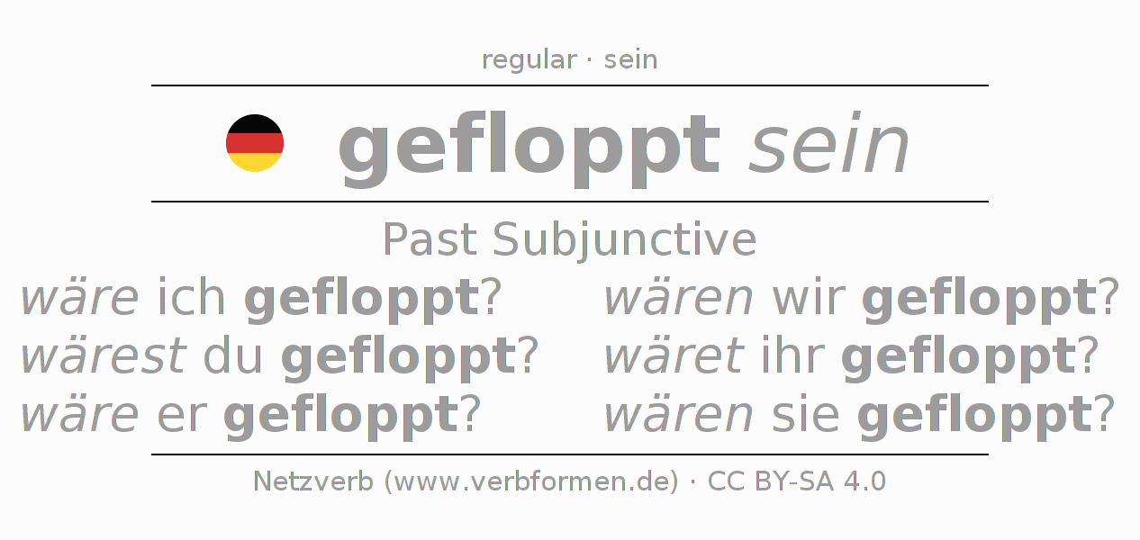 The conjugation of floppen in Subjunctive Imperfect Form of possibility Statal Passive is wäre ich gefloppt?, wärest du gefloppt?, wäre er gefloppt?, wären wir gefloppt?, wäret ihr gefloppt?, wären sie gefloppt?.The conjugation corresponds to certain grammatical rules. Likewise the requirements for the conjugation of the simple verb forms of floppen in Imperfect Subjunctive. Comments ☆