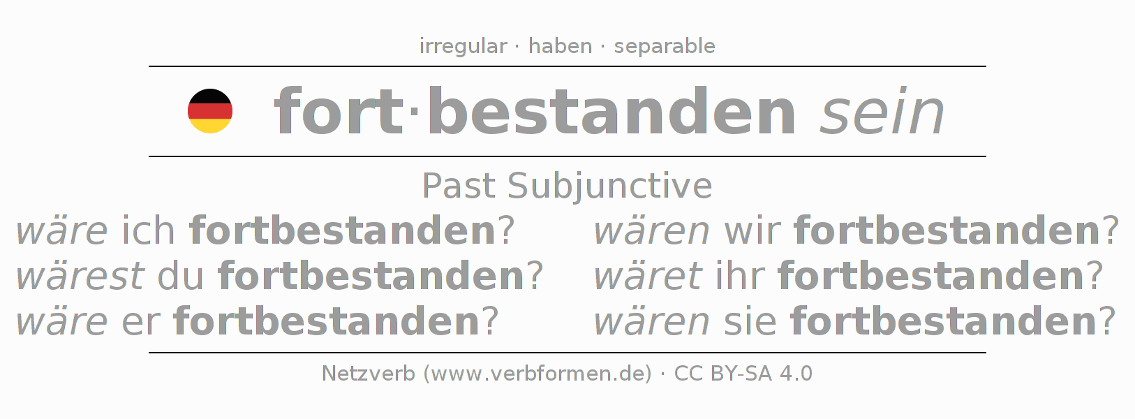 The conjugation of fortbestehen in Subjunctive Imperfect Form of possibility Statal Passive is wäre ich fortbestanden?, wärest du fortbestanden?, wäre er fortbestanden?, wären wir fortbestanden?, wäret ihr fortbestanden?, wären sie fortbestanden?.The conjugation corresponds to certain grammatical rules. Likewise the requirements for the conjugation of the simple verb forms of fortbestehen in Imperfect Subjunctive. Comments ☆