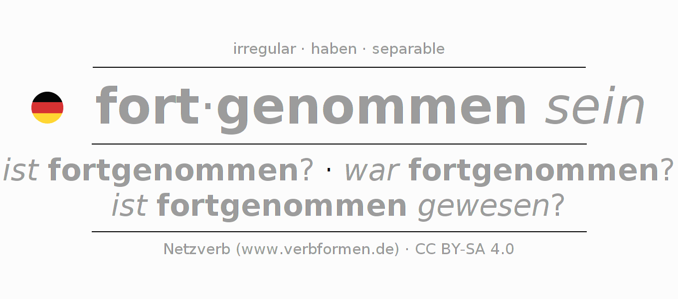 The conjugation of fortnehmen in Subjunctive Imperfect Form of possibility Statal Passive is wäre ich fortgenommen?, wärest du fortgenommen?, wäre er fortgenommen?, wären wir fortgenommen?, wäret ihr fortgenommen?, wären sie fortgenommen?.The conjugation corresponds to certain grammatical rules. Likewise the requirements for the conjugation of the simple verb forms of fortnehmen in Imperfect Subjunctive. Comments ☆