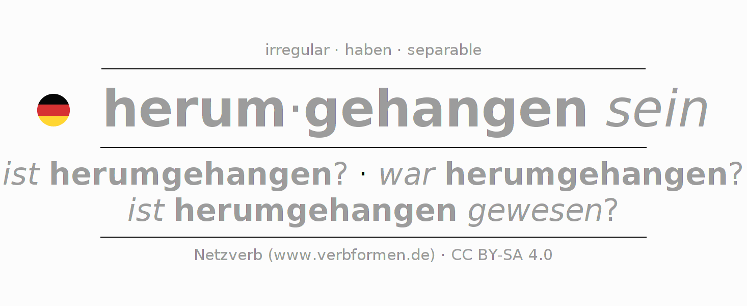 The conjugation of herumhängen in Subjunctive Imperfect Form of possibility Statal Passive is wäre ich herumgehangen?, wärest du herumgehangen?, wäre er herumgehangen?, wären wir herumgehangen?, wäret ihr herumgehangen?, wären sie herumgehangen?.The conjugation corresponds to certain grammatical rules. Likewise the requirements for the conjugation of the simple verb forms of herumhängen in Imperfect Subjunctive. Comments ☆