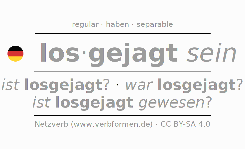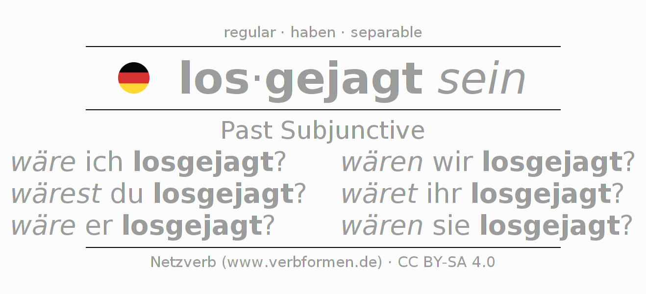 The conjugation of losjagen in Subjunctive Imperfect Form of possibility Statal Passive is wäre ich losgejagt?, wärest du losgejagt?, wäre er losgejagt?, wären wir losgejagt?, wäret ihr losgejagt?, wären sie losgejagt?.The conjugation corresponds to certain grammatical rules. Likewise the requirements for the conjugation of the simple verb forms of losjagen in Imperfect Subjunctive. Comments ☆