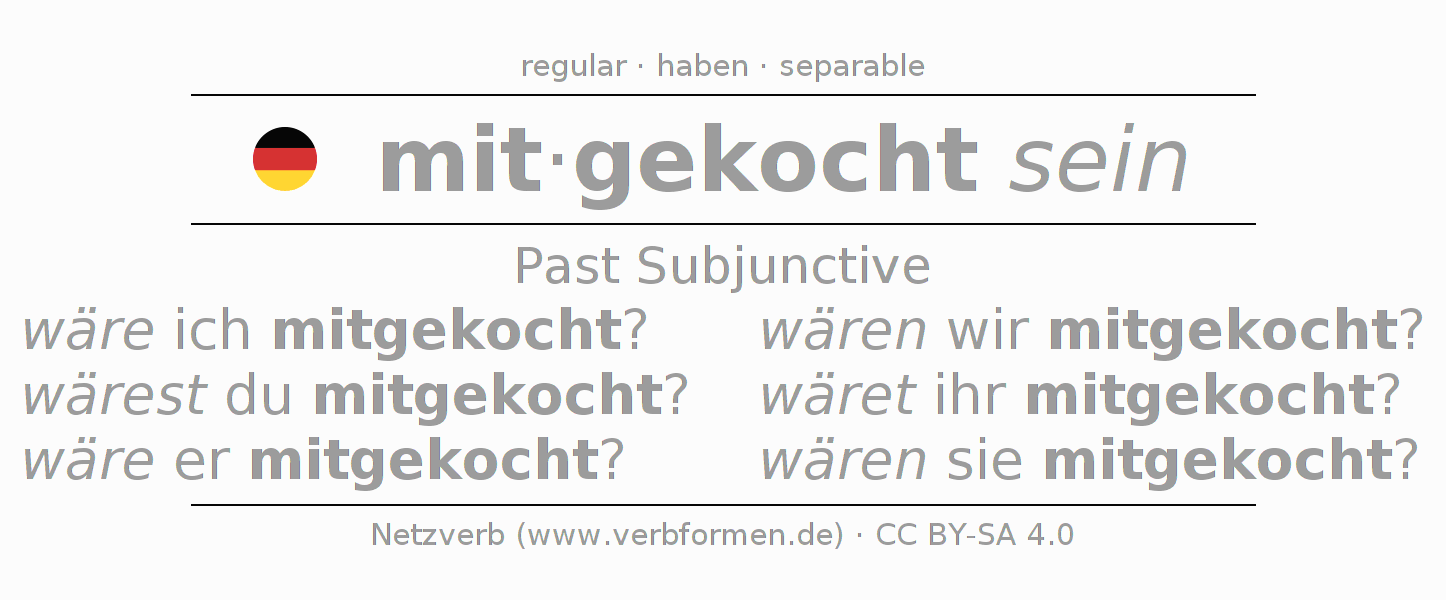 The conjugation of mitkochen in Subjunctive Imperfect Form of possibility Statal Passive is wäre ich mitgekocht?, wärest du mitgekocht?, wäre er mitgekocht?, wären wir mitgekocht?, wäret ihr mitgekocht?, wären sie mitgekocht?.The conjugation corresponds to certain grammatical rules. Likewise the requirements for the conjugation of the simple verb forms of mitkochen in Imperfect Subjunctive. Comments ☆