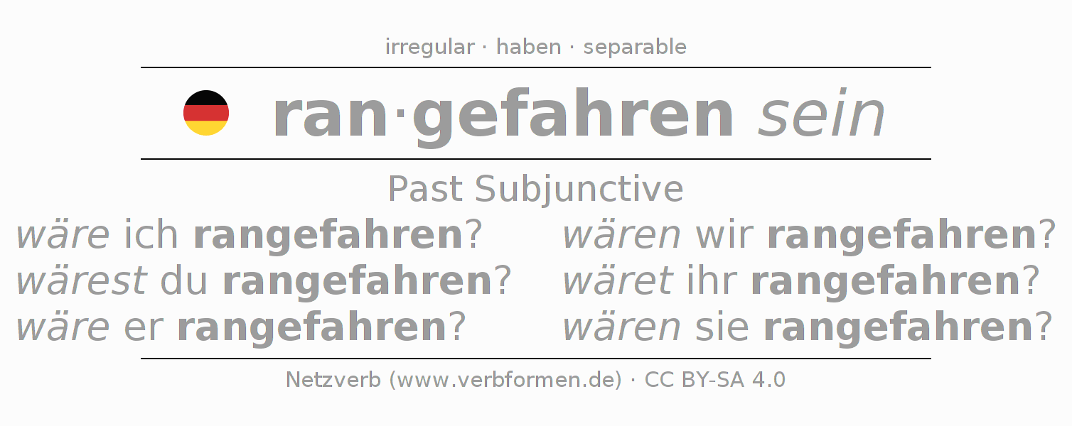 The conjugation of ranfahren in Subjunctive Imperfect Form of possibility Statal Passive is wäre ich rangefahren?, wärest du rangefahren?, wäre er rangefahren?, wären wir rangefahren?, wäret ihr rangefahren?, wären sie rangefahren?.The conjugation corresponds to certain grammatical rules. Likewise the requirements for the conjugation of the simple verb forms of ranfahren in Imperfect Subjunctive. Comments ☆