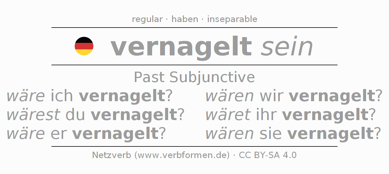 The conjugation of vernageln in Subjunctive Imperfect Form of possibility Statal Passive is wäre ich vernagelt?, wärest du vernagelt?, wäre er vernagelt?, wären wir vernagelt?, wäret ihr vernagelt?, wären sie vernagelt?.The conjugation corresponds to certain grammatical rules. Likewise the requirements for the conjugation of the simple verb forms of vernageln in Imperfect Subjunctive. Comments ☆