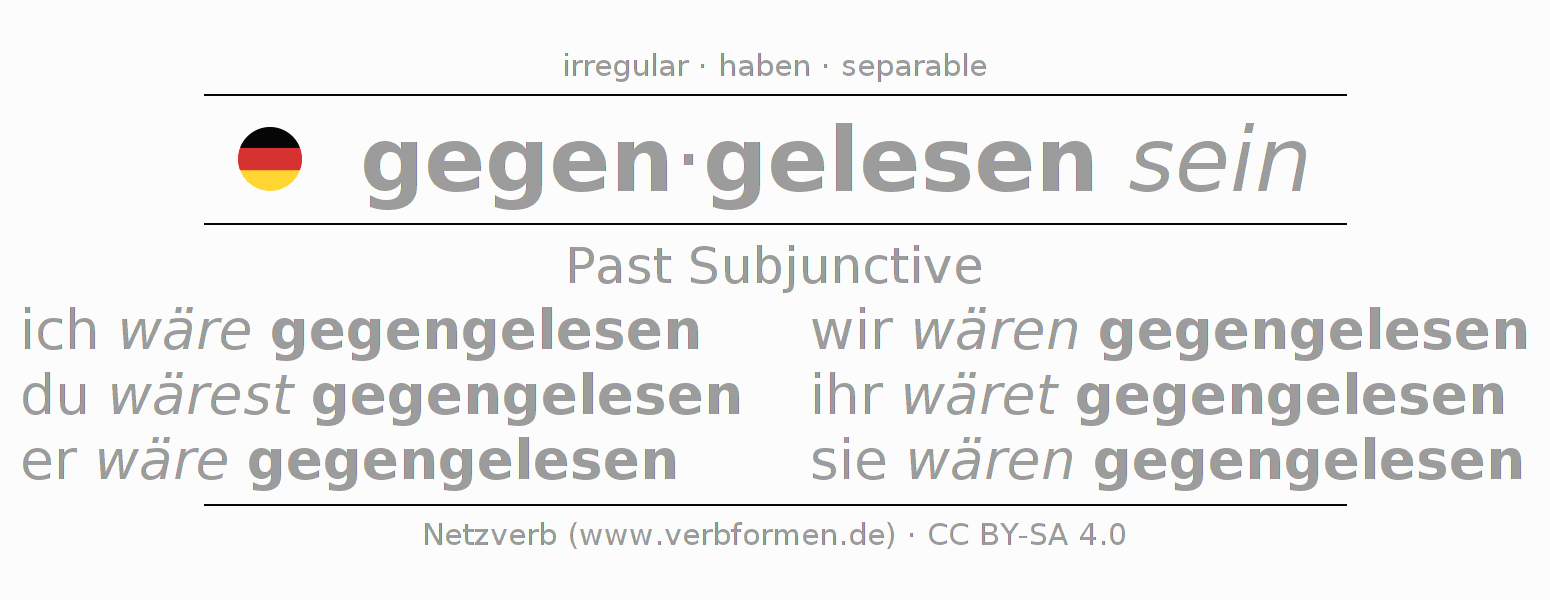 The conjugation of gegenlesen in Subjunctive Imperfect Form of possibility Statal Passive is ich wäre gegengelesen, du wärest gegengelesen, er wäre gegengelesen, wir wären gegengelesen, ihr wäret gegengelesen, sie wären gegengelesen.The conjugation corresponds to certain grammatical rules. Likewise the requirements for the conjugation of the simple verb forms of gegenlesen in Imperfect Subjunctive. Comments ☆