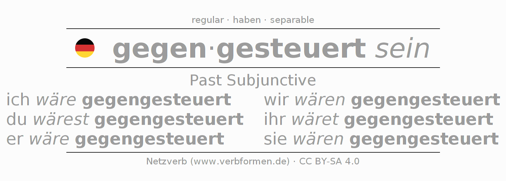 The conjugation of gegensteuern in Subjunctive Imperfect Form of possibility Statal Passive is ich wäre gegengesteuert, du wärest gegengesteuert, er wäre gegengesteuert, wir wären gegengesteuert, ihr wäret gegengesteuert, sie wären gegengesteuert.The conjugation corresponds to certain grammatical rules. Likewise the requirements for the conjugation of the simple verb forms of gegensteuern in Imperfect Subjunctive. Comments ☆