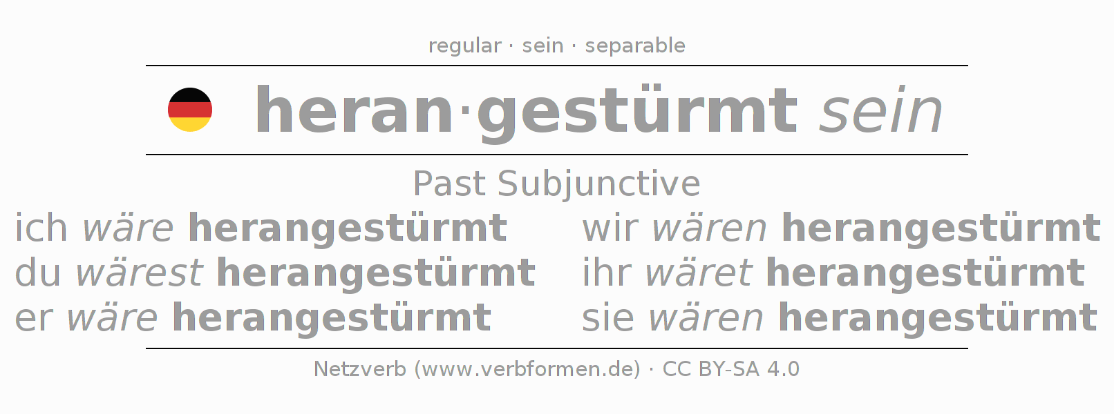 The verb heranstürmen fully conjugated in all persons and numbers in the Subjunctive Imperfect