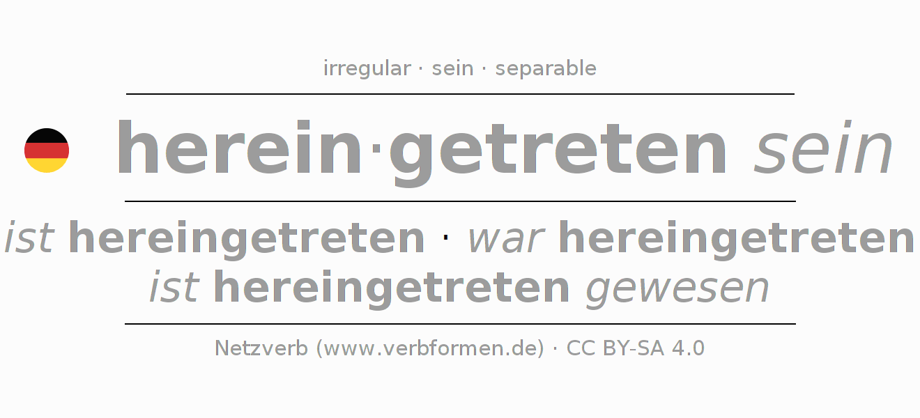 The conjugation of hereintreten in Subjunctive Imperfect Form of possibility Statal Passive is ich wäre hereingetreten, du wärest hereingetreten, er wäre hereingetreten, wir wären hereingetreten, ihr wäret hereingetreten, sie wären hereingetreten.The conjugation corresponds to certain grammatical rules. Likewise the requirements for the conjugation of the simple verb forms of hereintreten in Imperfect Subjunctive. Comments ☆