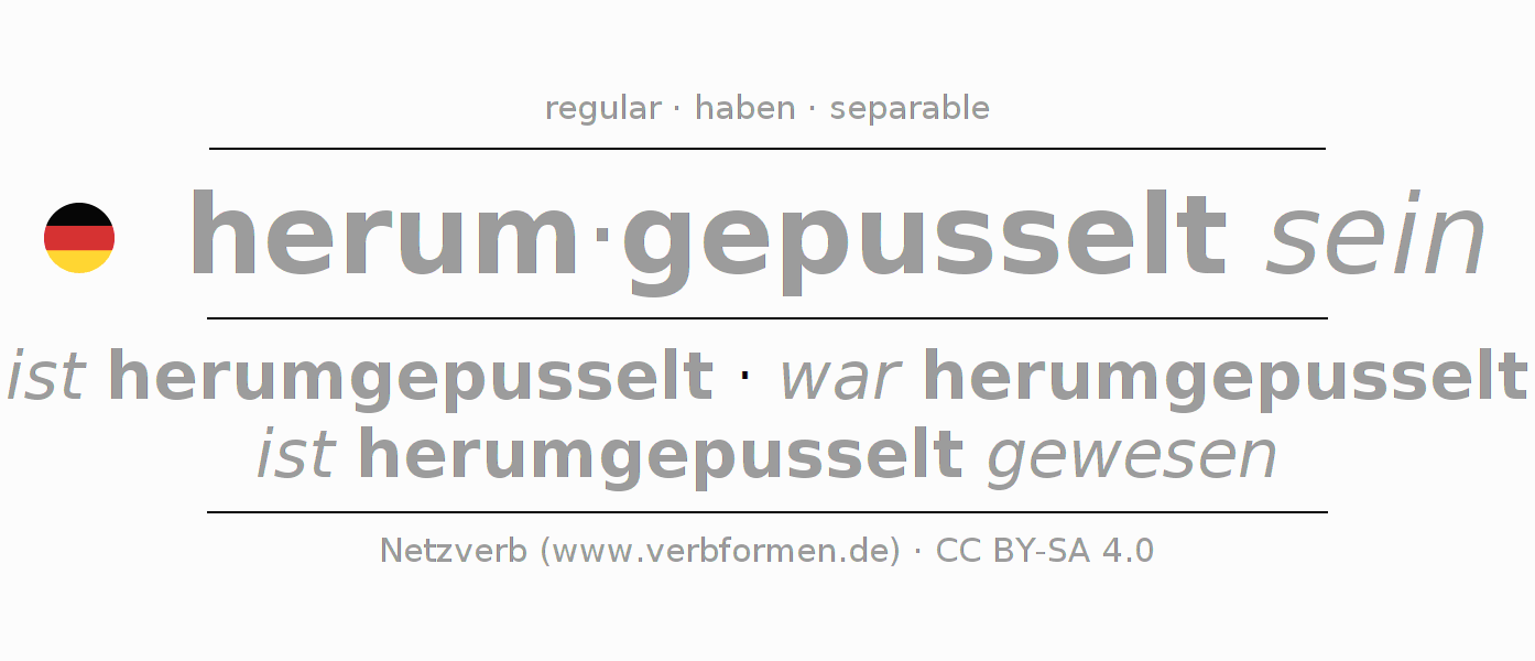 The conjugation of herumpusseln in Subjunctive Imperfect Form of possibility Statal Passive is ich wäre herumgepusselt, du wärest herumgepusselt, er wäre herumgepusselt, wir wären herumgepusselt, ihr wäret herumgepusselt, sie wären herumgepusselt.The conjugation corresponds to certain grammatical rules. Likewise the requirements for the conjugation of the simple verb forms of herumpusseln in Imperfect Subjunctive. Comments ☆