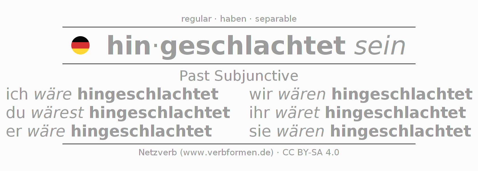 The conjugation of hinschlachten in Subjunctive Imperfect Form of possibility Statal Passive is ich wäre hingeschlachtet, du wärest hingeschlachtet, er wäre hingeschlachtet, wir wären hingeschlachtet, ihr wäret hingeschlachtet, sie wären hingeschlachtet.The conjugation corresponds to certain grammatical rules. Likewise the requirements for the conjugation of the simple verb forms of hinschlachten in Imperfect Subjunctive. Comments ☆