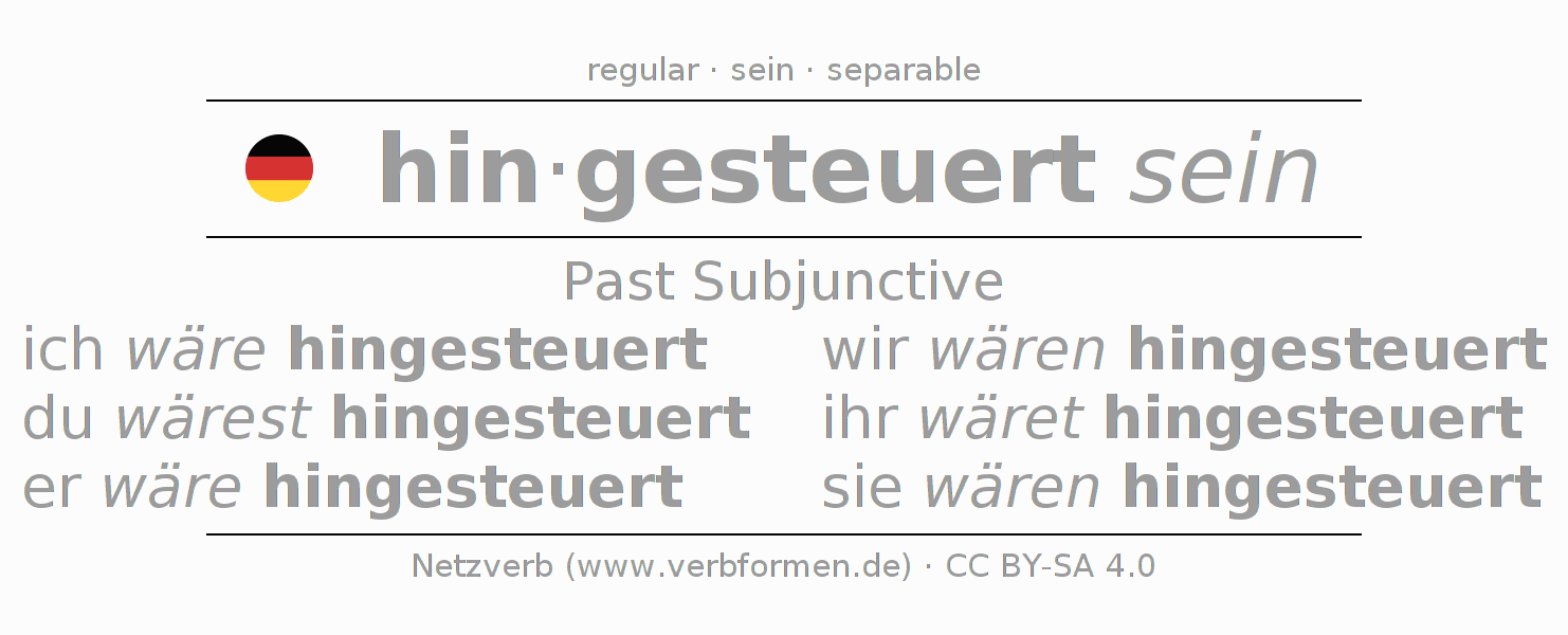 The conjugation of hinsteuern in Subjunctive Imperfect Form of possibility Statal Passive is ich wäre hingesteuert, du wärest hingesteuert, er wäre hingesteuert, wir wären hingesteuert, ihr wäret hingesteuert, sie wären hingesteuert.The conjugation corresponds to certain grammatical rules. Likewise the requirements for the conjugation of the simple verb forms of hinsteuern in Imperfect Subjunctive. Comments ☆