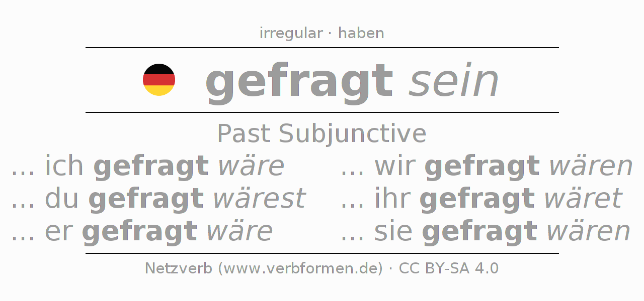 The conjugation of fragen in Subjunctive Imperfect Form of possibility Statal Passive is ... ich gefragt wäre, ... du gefragt wärest, ... er gefragt wäre, ... wir gefragt wären, ... ihr gefragt wäret, ... sie gefragt wären.The conjugation corresponds to certain grammatical rules. Likewise the requirements for the conjugation of the simple verb forms of fragen in Imperfect Subjunctive. Comments ☆