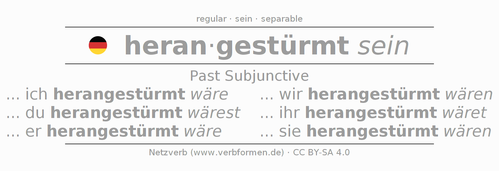The verb heranstürmen fully conjugated in all persons and numbers in the Subjunctive Imperfect