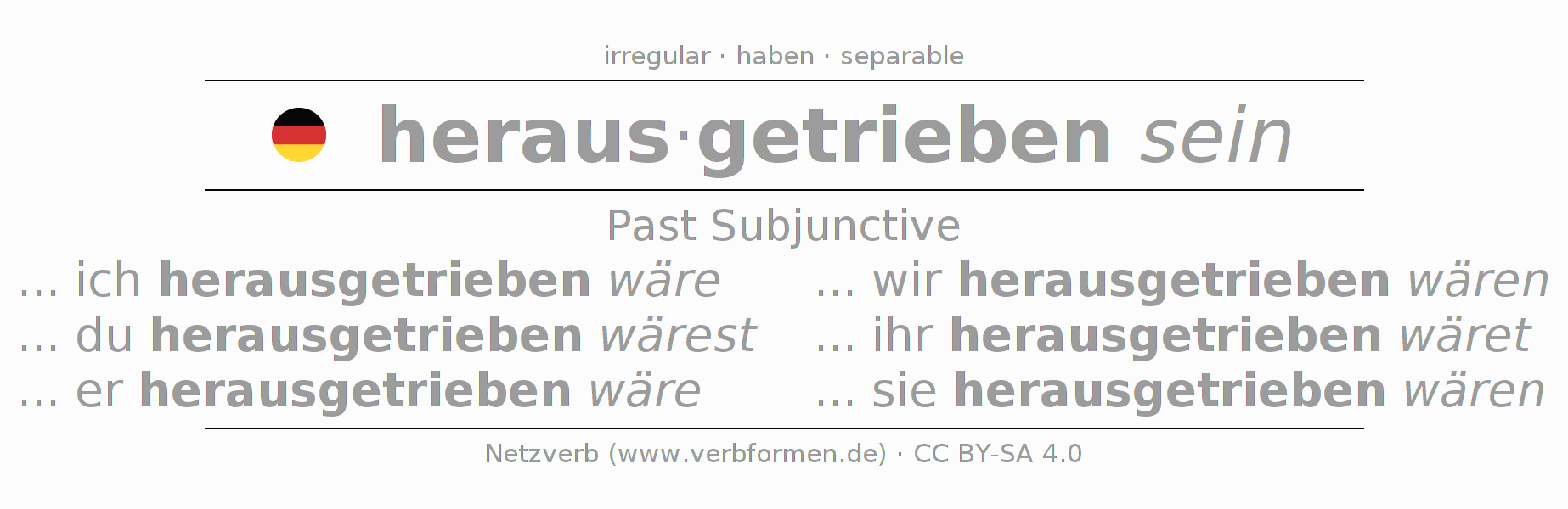The conjugation of heraustreiben in Subjunctive Imperfect Form of possibility Statal Passive is ... ich herausgetrieben wäre, ... du herausgetrieben wärest, ... er herausgetrieben wäre, ... wir herausgetrieben wären, ... ihr herausgetrieben wäret, ... sie herausgetrieben wären.The conjugation corresponds to certain grammatical rules. Likewise the requirements for the conjugation of the simple verb forms of heraustreiben in Imperfect Subjunctive. Comments ☆