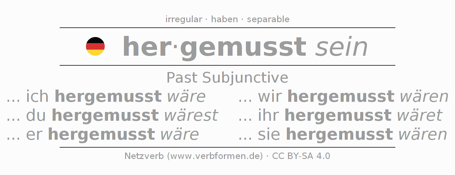 The conjugation of hermüssen in Subjunctive Imperfect Form of possibility Statal Passive is ... ich hergemusst wäre, ... du hergemusst wärest, ... er hergemusst wäre, ... wir hergemusst wären, ... ihr hergemusst wäret, ... sie hergemusst wären.The conjugation corresponds to certain grammatical rules. Likewise the requirements for the conjugation of the simple verb forms of hermüssen in Imperfect Subjunctive. Comments ☆