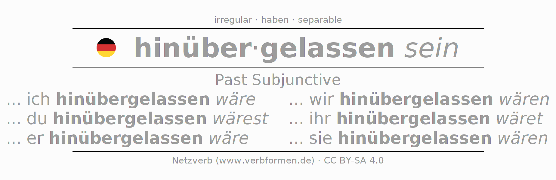 The conjugation of hinüberlassen in Subjunctive Imperfect Form of possibility Statal Passive is ... ich hinübergelassen wäre, ... du hinübergelassen wärest, ... er hinübergelassen wäre, ... wir hinübergelassen wären, ... ihr hinübergelassen wäret, ... sie hinübergelassen wären.The conjugation corresponds to certain grammatical rules. Likewise the requirements for the conjugation of the simple verb forms of hinüberlassen in Imperfect Subjunctive. Comments ☆