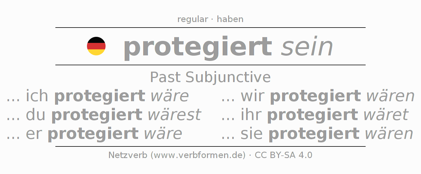 The conjugation of protegieren in Subjunctive Imperfect Form of possibility Statal Passive is ... ich protegiert wäre, ... du protegiert wärest, ... er protegiert wäre, ... wir protegiert wären, ... ihr protegiert wäret, ... sie protegiert wären.The conjugation corresponds to certain grammatical rules. Likewise the requirements for the conjugation of the simple verb forms of protegieren in Imperfect Subjunctive. Comments ☆