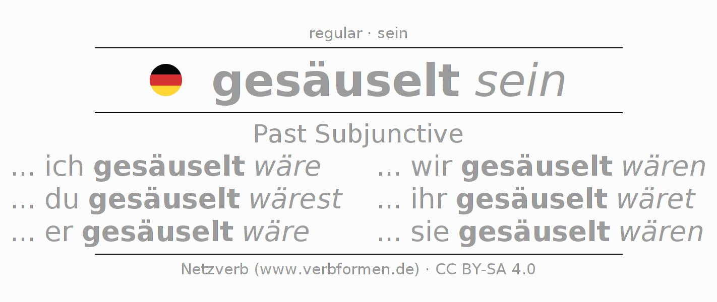 The conjugation of säuseln in Subjunctive Imperfect Form of possibility Statal Passive is ... ich gesäuselt wäre, ... du gesäuselt wärest, ... er gesäuselt wäre, ... wir gesäuselt wären, ... ihr gesäuselt wäret, ... sie gesäuselt wären.The conjugation corresponds to certain grammatical rules. Likewise the requirements for the conjugation of the simple verb forms of säuseln in Imperfect Subjunctive. Comments ☆