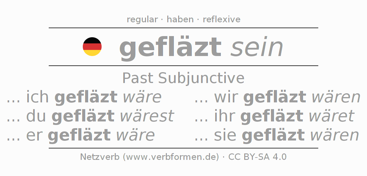 The conjugation of sich fläzen in Subjunctive Imperfect Form of possibility Statal Passive is ... ich gefläzt wäre, ... du gefläzt wärest, ... er gefläzt wäre, ... wir gefläzt wären, ... ihr gefläzt wäret, ... sie gefläzt wären.The conjugation corresponds to certain grammatical rules. Likewise the requirements for the conjugation of the simple verb forms of fläzen in Imperfect Subjunctive. Comments ☆