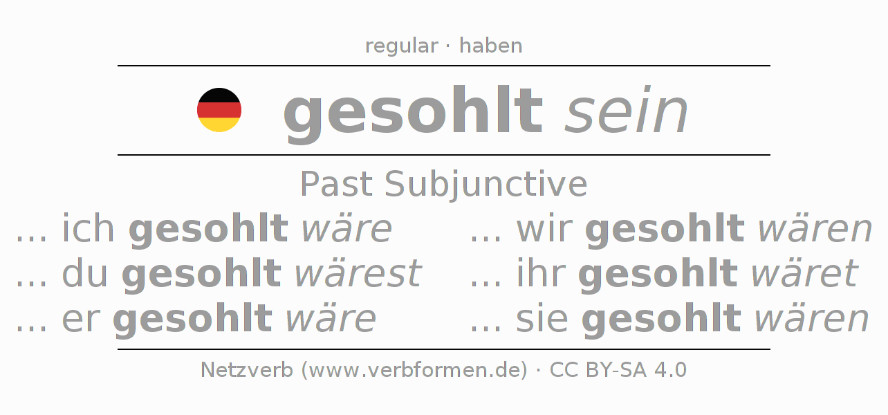 The conjugation of sohlen in Subjunctive Imperfect Form of possibility Statal Passive is ... ich gesohlt wäre, ... du gesohlt wärest, ... er gesohlt wäre, ... wir gesohlt wären, ... ihr gesohlt wäret, ... sie gesohlt wären.The conjugation corresponds to certain grammatical rules. Likewise the requirements for the conjugation of the simple verb forms of sohlen in Imperfect Subjunctive. Comments ☆