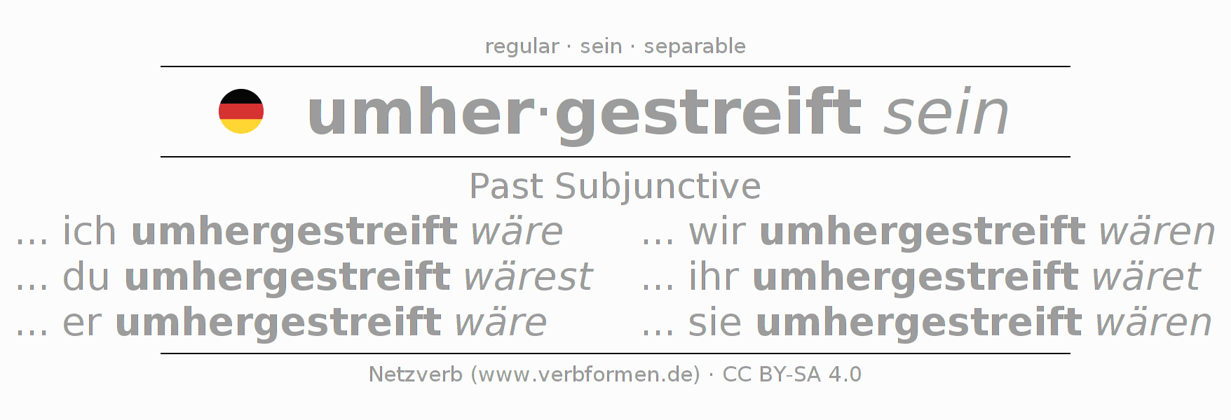 The conjugation of umherstreifen in Subjunctive Imperfect Form of possibility Statal Passive is ... ich umhergestreift wäre, ... du umhergestreift wärest, ... er umhergestreift wäre, ... wir umhergestreift wären, ... ihr umhergestreift wäret, ... sie umhergestreift wären.The conjugation corresponds to certain grammatical rules. Likewise the requirements for the conjugation of the simple verb forms of umherstreifen in Imperfect Subjunctive. Comments ☆