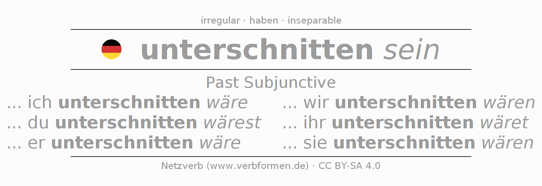 The conjugation of unterschneiden in Subjunctive Imperfect Form of possibility Statal Passive is ... ich unterschnitten wäre, ... du unterschnitten wärest, ... er unterschnitten wäre, ... wir unterschnitten wären, ... ihr unterschnitten wäret, ... sie unterschnitten wären.The conjugation corresponds to certain grammatical rules. Likewise the requirements for the conjugation of the simple verb forms of unterschneiden in Imperfect Subjunctive. Comments ☆