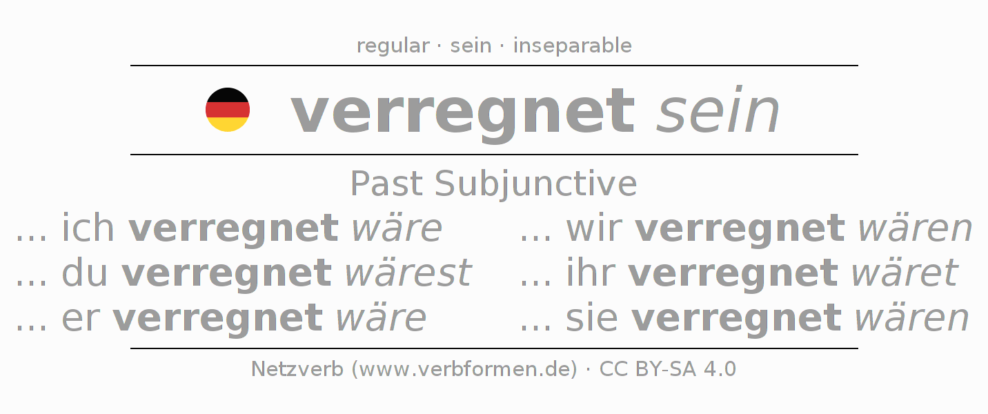 The conjugation of verregnen in Subjunctive Imperfect Form of possibility Statal Passive is ... ich verregnet wäre, ... du verregnet wärest, ... er verregnet wäre, ... wir verregnet wären, ... ihr verregnet wäret, ... sie verregnet wären.The conjugation corresponds to certain grammatical rules. Likewise the requirements for the conjugation of the simple verb forms of verregnen in Imperfect Subjunctive. Comments ☆