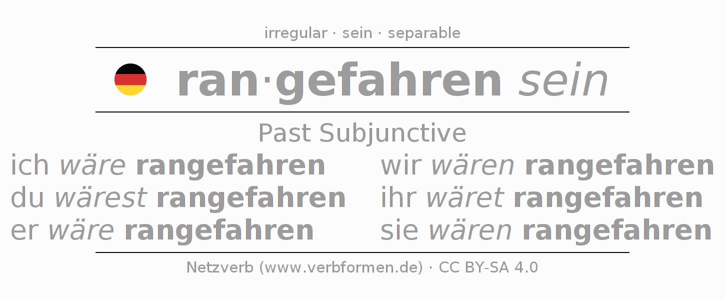 The conjugation of ranfahren in Subjunctive Imperfect Form of possibility Statal Passive is ich wäre rangefahren, du wärest rangefahren, er wäre rangefahren, wir wären rangefahren, ihr wäret rangefahren, sie wären rangefahren.The conjugation corresponds to certain grammatical rules. Likewise the requirements for the conjugation of the simple verb forms of ranfahren in Imperfect Subjunctive. Comments ☆