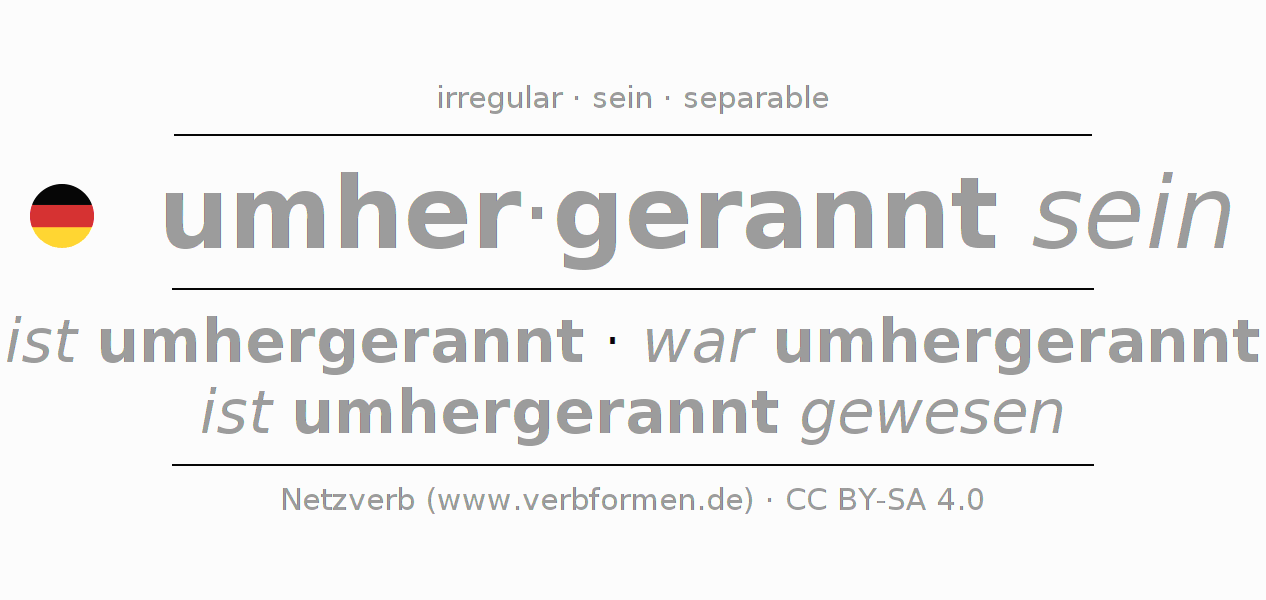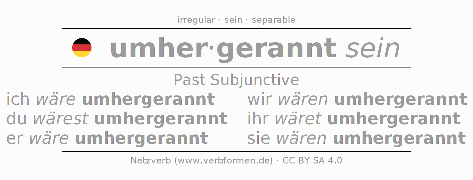 The conjugation of umherrennen in Subjunctive Imperfect Form of possibility Statal Passive is ich wäre umhergerannt, du wärest umhergerannt, er wäre umhergerannt, wir wären umhergerannt, ihr wäret umhergerannt, sie wären umhergerannt.The conjugation corresponds to certain grammatical rules. Likewise the requirements for the conjugation of the simple verb forms of umherrennen in Imperfect Subjunctive. Comments ☆