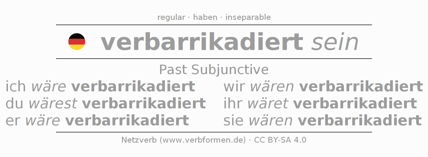 The conjugation of verbarrikadieren in Subjunctive Imperfect Form of possibility Statal Passive is ich wäre verbarrikadiert, du wärest verbarrikadiert, er wäre verbarrikadiert, wir wären verbarrikadiert, ihr wäret verbarrikadiert, sie wären verbarrikadiert.The conjugation corresponds to certain grammatical rules. Likewise the requirements for the conjugation of the simple verb forms of verbarrikadieren in Imperfect Subjunctive. Comments ☆