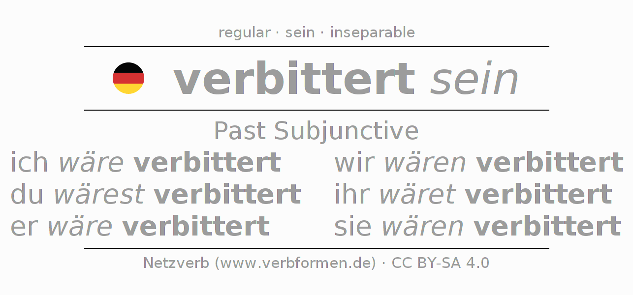 The conjugation of verbittern in Subjunctive Imperfect Form of possibility Statal Passive is ich wäre verbittert, du wärest verbittert, er wäre verbittert, wir wären verbittert, ihr wäret verbittert, sie wären verbittert.The conjugation corresponds to certain grammatical rules. Likewise the requirements for the conjugation of the simple verb forms of verbittern in Imperfect Subjunctive. Comments ☆