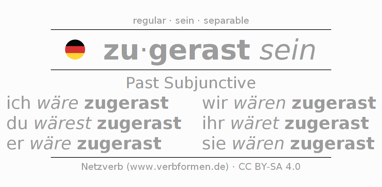 The conjugation of zurasen in Subjunctive Imperfect Form of possibility Statal Passive is ich wäre zugerast, du wärest zugerast, er wäre zugerast, wir wären zugerast, ihr wäret zugerast, sie wären zugerast.The conjugation corresponds to certain grammatical rules. Likewise the requirements for the conjugation of the simple verb forms of zurasen in Imperfect Subjunctive. 1Comment ☆1.0