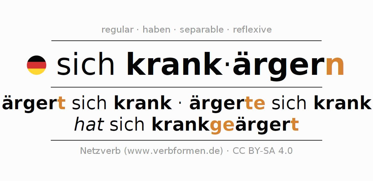 - Future Perfect: ich werde mir/mich krankgeärgert haben, du wirst dir/dich krankgeärgert haben, er wird sich krankgeärgert haben, wir werden uns krankgeärgert haben, ihr werdet euch krankgeärgert haben, sie werden sich krankgeärgert haben