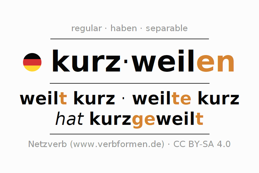 Clear online presentation of the verb 'kurz·weilen' including all verb forms. Therfore, the flection of the verb kurz·weilen can be useful for homework, tests, exams, German lessons in school, learning German, during studies and adult education. Especially for people learning German it is essential to know the correct flection of a verb (weilt kurz - weilte kurz - hat kurzgeweilt).