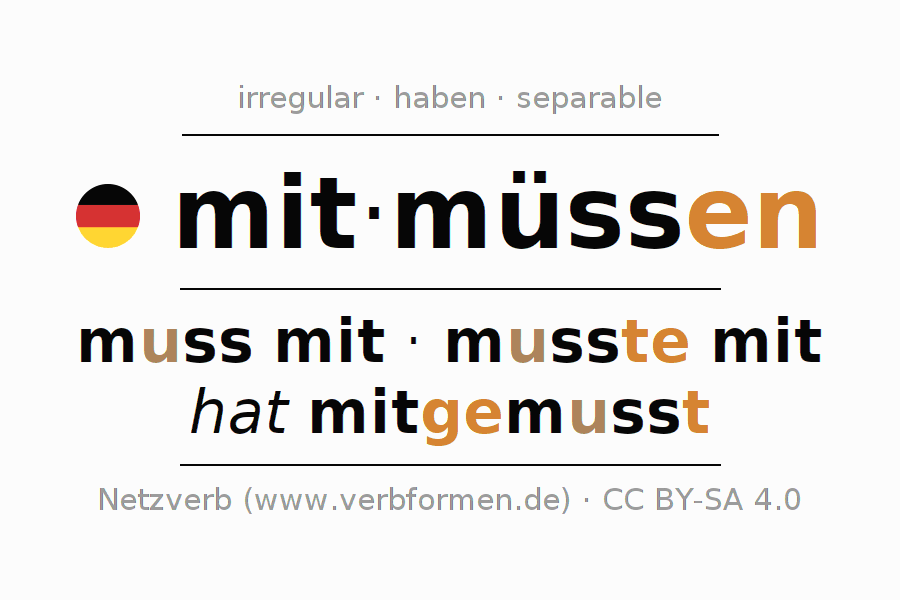 - Future: ich werde mitmüssen, du wirst mitmüssen, er wird mitmüssen, wir werden mitmüssen, ihr werdet mitmüssen, sie werden mitmüssen