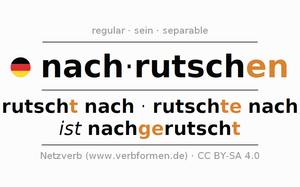 Clear online presentation of the verb 'nach·rutschen' including all verb forms. Therfore, the flection of the verb nach·rutschen can be useful for homework, tests, exams, German lessons in school, learning German, during studies and adult education. Especially for people learning German it is essential to know the correct flection of a verb (rutscht nach - rutschte nach - ist nachgerutscht).
