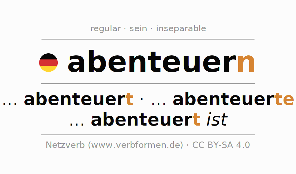 Clear online presentation of the verb 'abenteuern' including all verb forms. Therfore, the flection of the verb abenteuern can be useful for homework, tests, exams, German lessons in school, learning German, during studies and adult education. Especially for people learning German it is essential to know the correct flection of a verb (... abenteuert - ... abenteuerte - ... abenteuert ist).