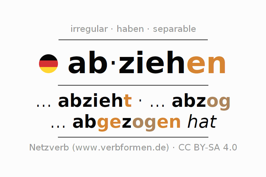 Clear online presentation of the verb 'ab·ziehen' including all verb forms. Therfore, the flection of the verb ab·ziehen can be useful for homework, tests, exams, German lessons in school, learning German, during studies and adult education. Especially for people learning German it is essential to know the correct flection of a verb (... abzieht - ... abzog - ... abgezogen hat).