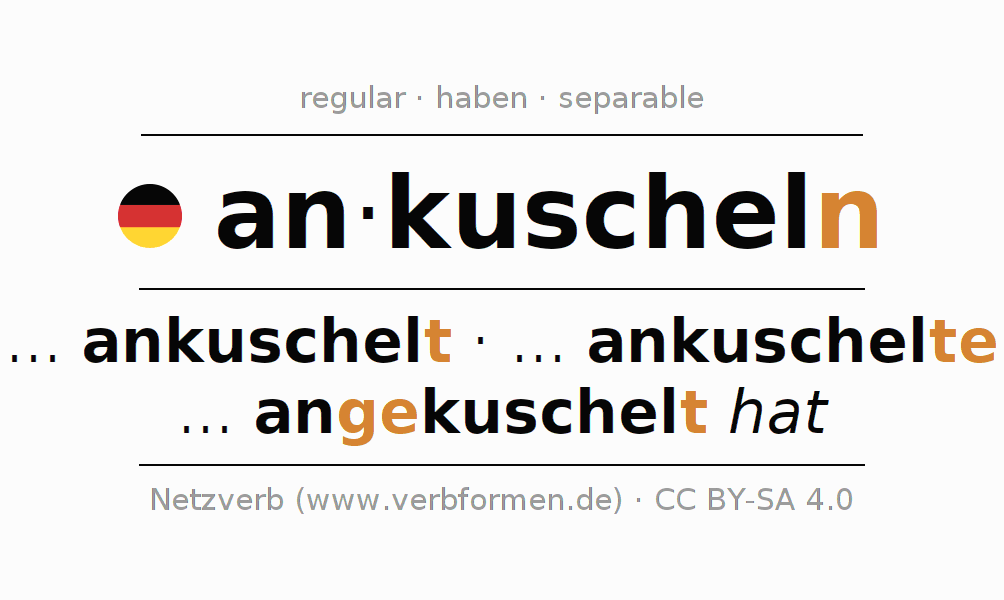 - Future: ... ich ankuscheln werde, ... du ankuscheln wirst, ... er ankuscheln wird, ... wir ankuscheln werden, ... ihr ankuscheln werdet, ... sie ankuscheln werden