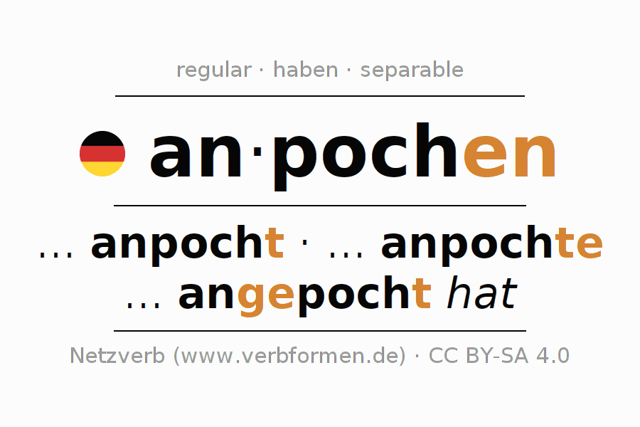 - Present: poch(e) (du) an, pochen wir an, pocht (ihr) an, pochen Sie an