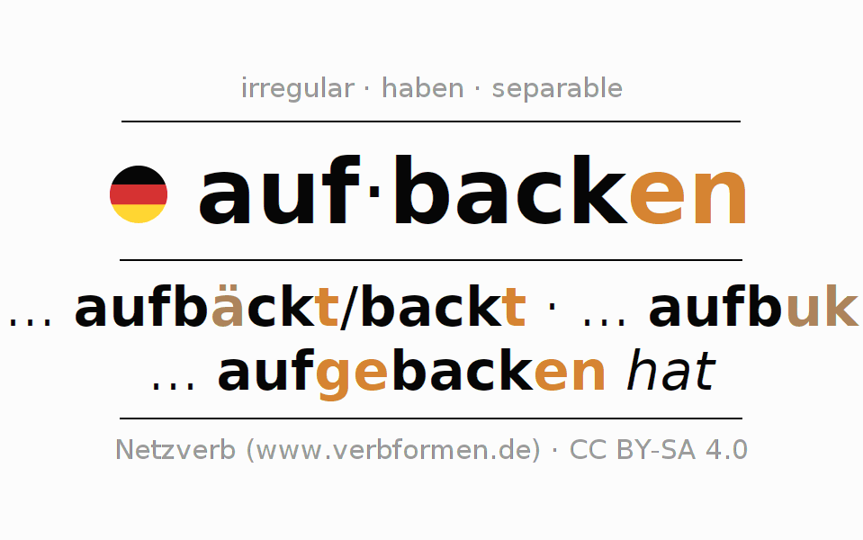- Present: back(e) (du) auf, backen wir auf, backt (ihr) auf, backen Sie auf